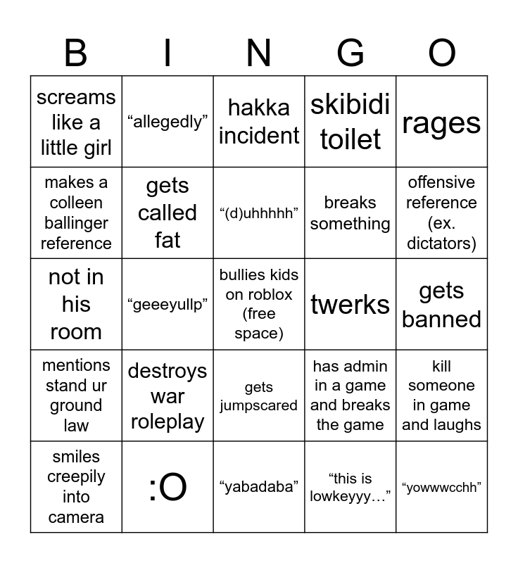 This bingo card has a free space and 24 words: destroys war roleplay, :O, “(d)uhhhhh”, smiles creepily into camera, rages, screams like a little girl, makes a colleen ballinger reference, “allegedly”, twerks, gets jumpscared, breaks something, not in his room, has admin in a game and breaks the game, kill someone in game and laughs, gets called fat, “this is lowkeyyy…”, gets banned, hakka incident, offensive reference (ex. dictators), “geeeyullp”, “yowwwcchh”, mentions stand ur ground law, skibidi toilet and “yabadaba”.