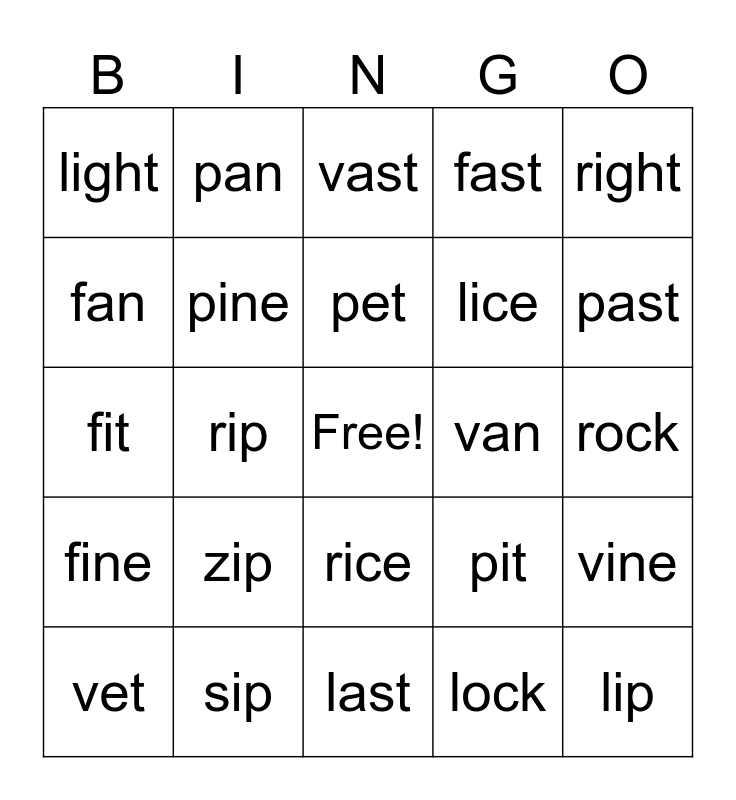 This bingo card has a free space and 24 words: zip, sip, pet, vet, right, light, fan, pan, van, rice, lice, fit, pit, vine, pine, lock, rock, vast, past, rip, lip, fine, fast and last.