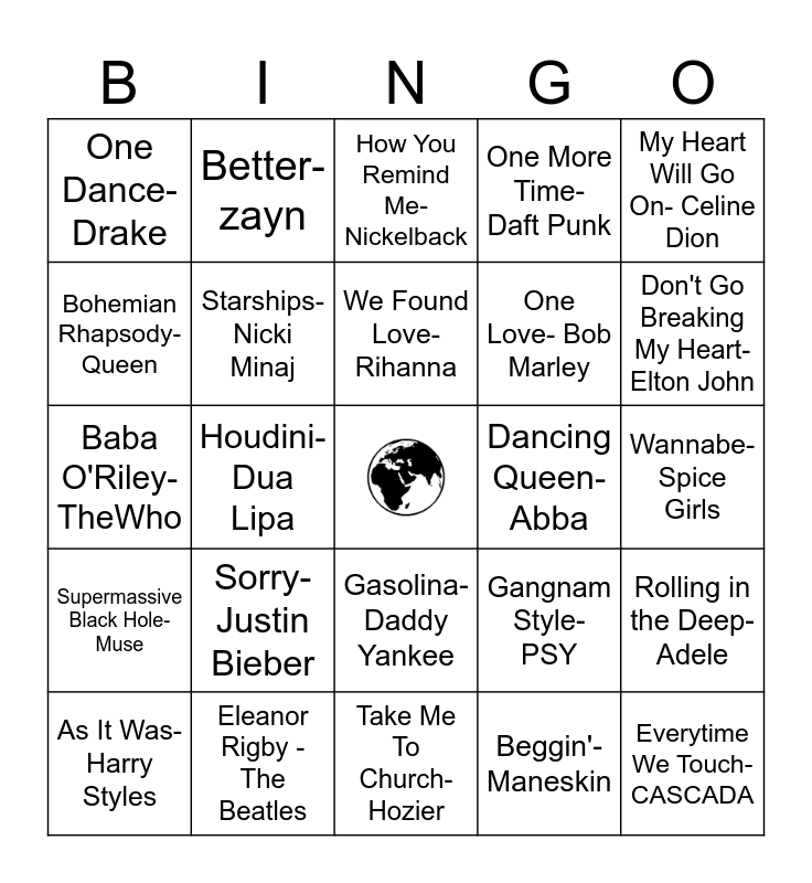 This bingo card has a free space and 24 words: Sorry- Justin Bieber, Eleanor Rigby - The Beatles, We Found Love- Rihanna, As It Was- Harry Styles, My Heart Will Go On- Celine Dion, One Dance- Drake, Bohemian Rhapsody- Queen, Better- zayn, Dancing Queen- Abba, Gasolina- Daddy Yankee, One Love- Bob Marley, Baba O'Riley- TheWho, Gangnam Style- PSY, Rolling in the Deep- Adele, Starships- Nicki Minaj, Beggin'- Maneskin, Wannabe- Spice Girls, How You Remind Me- Nickelback, Don't Go Breaking My Heart- Elton John, Houdini- Dua Lipa, Everytime We Touch- CASCADA, Supermassive Black Hole- Muse, One More Time- Daft Punk and Take Me To Church- Hozier.