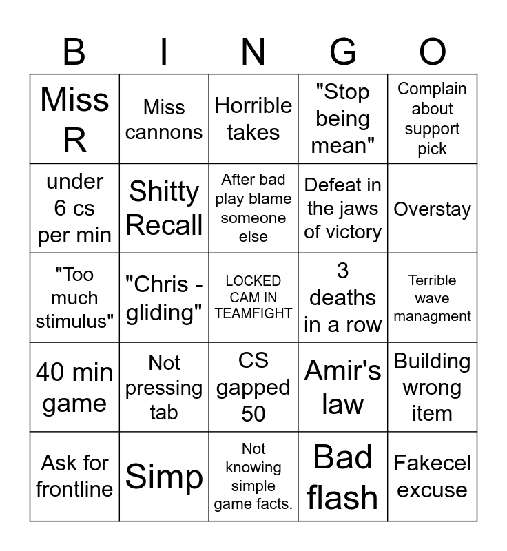 This bingo card has a free space and 24 words: Not pressing tab, Simp, After bad play blame someone else, Ask for frontline, Complain about support pick, Miss R, under 6 cs per min, Miss cannons, 3 deaths in a row, CS gapped 50, Defeat in the jaws of victory, "Too much stimulus", Amir's law, Building wrong item, Shitty Recall, Bad flash, Terrible wave managment, Horrible takes, Overstay, "Chris -gliding", Fakecel excuse, 40 min game, "Stop being mean" and Not knowing simple game facts..