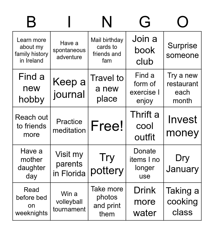 This bingo card has a free space and 24 words: Visit my parents in Florida, Win a volleyball tournament, Travel to a new place, Read before bed on weeknights, Surprise someone, Learn more about my family history in Ireland, Find a new hobby, Have a spontaneous adventure, Thrift a cool outfit, Try pottery, Find a form of exercise I enjoy, Reach out to friends more, Donate items I no longer use, Dry January, Keep a journal, Drink more water, Invest money, Mail birthday cards to friends and fam, Try a new restaurant each month, Practice meditation, Taking a cooking class, Have a mother daughter day, Join a book club and Take more photos and print them.