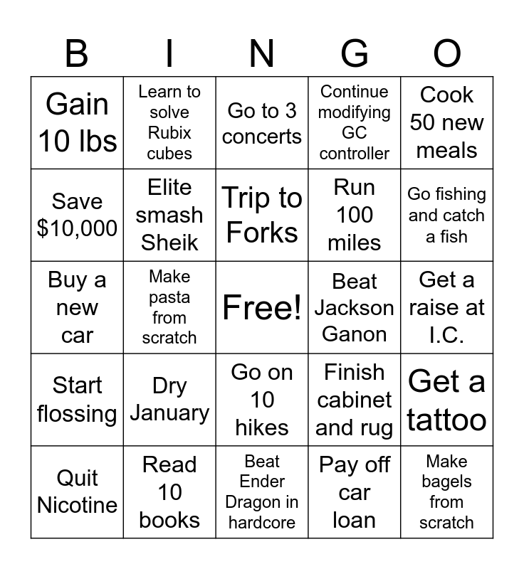 This bingo card has a free space and 24 words: Dry January, Read 10 books, Trip to Forks, Quit Nicotine, Cook 50 new meals, Gain 10 lbs, Save $10,000, Learn to solve Rubix cubes, Beat Jackson Ganon, Go on 10 hikes, Run 100 miles, Buy a new car, Finish cabinet and rug, Get a tattoo, Elite smash Sheik, Pay off car loan, Get a raise at I.C., Go to 3 concerts, Go fishing and catch a fish, Make pasta from scratch, Make bagels from scratch, Start flossing, Continue modifying GC controller and Beat Ender Dragon in hardcore.