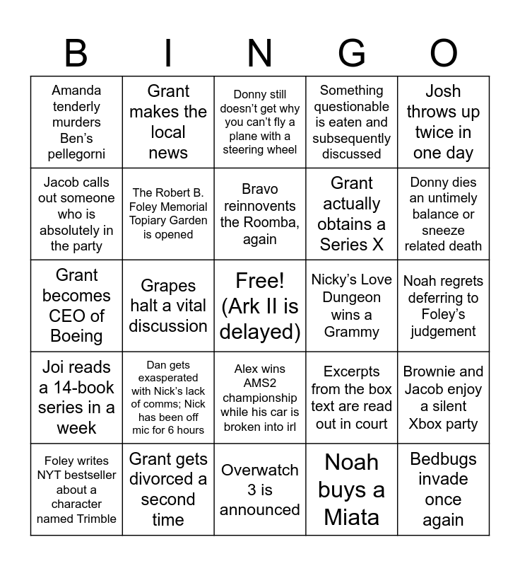 This bingo card has a free space and 24 words: Foley writes NYT bestseller about a character named Trimble, Dan gets exasperated with Nick’s lack of comms; Nick has been off mic for 6 hours, Bravo reinnovents the Roomba, again, Noah buys a Miata, Josh throws up twice in one day, Amanda tenderly murders Ben’s pellegorni, Grant makes the local news, Donny still doesn’t get why you can’t fly a plane with a steering wheel, Nicky’s Love Dungeon wins a Grammy, Noah regrets deferring to Foley’s judgement, Grant becomes CEO of Boeing, The Robert B. Foley Memorial Topiary Garden is opened, Excerpts from the box text are read out in court, Brownie and Jacob enjoy a silent Xbox party, Jacob calls out someone who is absolutely in the party, Grant gets divorced a second time, Overwatch 3 is announced, Something questionable is eaten and subsequently discussed, Donny dies an untimely balance or sneeze related death, Joi reads a 14-book series in a week, Grapes halt a vital discussion, Alex wins AMS2 championship while his car is broken into irl, Grant actually obtains a Series X and Bedbugs invade once again.