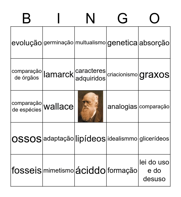 This bingo card has a free space and 24 words: adaptação, mimetismo, caracteres adquiridos, fosseis, absorção, evolução, comparação de órgãos, germinação, analogias, lipídeos, criacionismo, comparação de espécies, idealismmo, glicerídeos, lamarck, formação, comparação, multualismo, graxos, wallace, lei do uso e do desuso, ossos, genetica and áciddo.