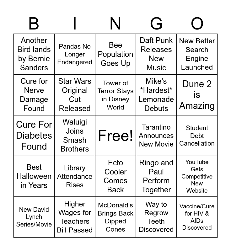 This bingo card has a free space and 24 words: Library Attendance Rises, Higher Wages for Teachers Bill Passed, Tower of Terror Stays in Disney World, New David Lynch Series/Movie, New Better Search Engine Launched, Another Bird lands by Bernie Sanders, Cure for Nerve Damage Found, Pandas No Longer Endangered, Tarantino Announces New Movie, Ecto Cooler Comes Back, Mike’s *Hardest* Lemonade Debuts, Cure For Diabetes Found, Ringo and Paul Perform Together, YouTube Gets Competitive New Website, Star Wars Original Cut Released, Way to Regrow Teeth Discovered, Student Debt Cancellation, Bee Population Goes Up, Dune 2 is Amazing, Waluigi Joins Smash Brothers, Vaccine/Cure for HIV & AIDs Discovered, Best Halloween in Years, Daft Punk Releases New Music and McDonald’s Brings Back Dipped Cones.