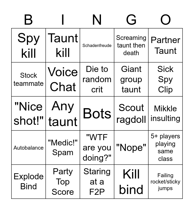 This bingo card has a free space and 24 words: "Medic!" Spam, Party Top Score, Die to random crit, Explode Bind, Partner Taunt, Spy kill, Stock teammate, Taunt kill, Scout ragdoll, "WTF are you doing?", Giant group taunt, "Nice shot!", "Nope", 5+ players playing same class, Voice Chat, Kill bind, Mikkle insulting, Schadenfreude, Sick Spy Clip, Any taunt, Failing rocket/sticky jumps, Autobalance, Screaming taunt then death and Staring at a F2P.