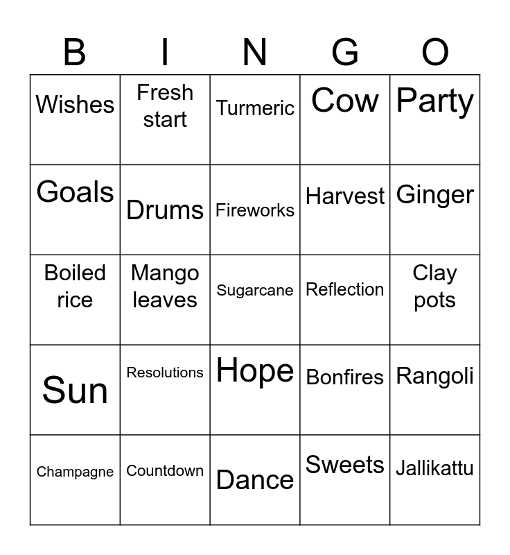 This bingo card has a free space and 24 words: Resolutions, Countdown, Fireworks, Champagne, Party, Wishes, Goals, Fresh start, Reflection, Hope, Harvest, Boiled rice, Bonfires, Rangoli, Drums, Sweets, Clay pots, Turmeric, Ginger, Mango leaves, Jallikattu, Sun, Cow and Dance.