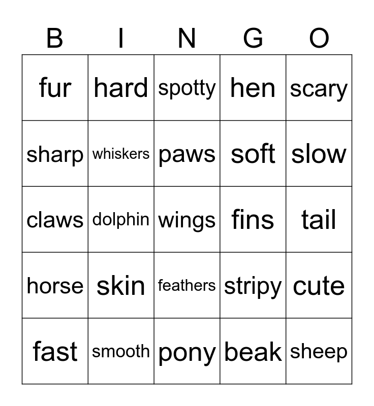 This bingo card has a free space and 24 words: skin, smooth, paws, fast, scary, fur, sharp, hard, fins, feathers, soft, claws, stripy, cute, whiskers, beak, tail, spotty, slow, dolphin, sheep, horse, hen and pony.