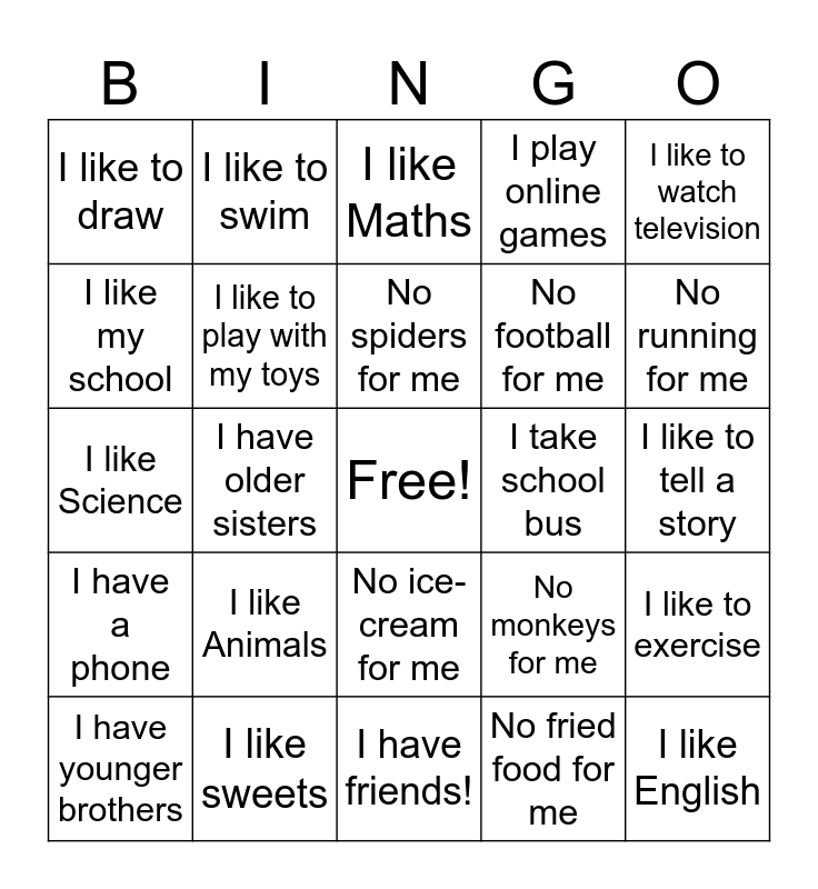 This bingo card has a free space and 24 words: I like Animals, I like sweets, No spiders for me, I have younger brothers, I like to watch television, I like to draw, I like my school, I like to swim, I take school bus, No ice-cream for me, No football for me, I like Science, No monkeys for me, I like to exercise, I like to play with my toys, No fried food for me, I like to tell a story, I like Maths, No running for me, I have older sisters, I like English, I have a phone, I play online games and I have friends!.