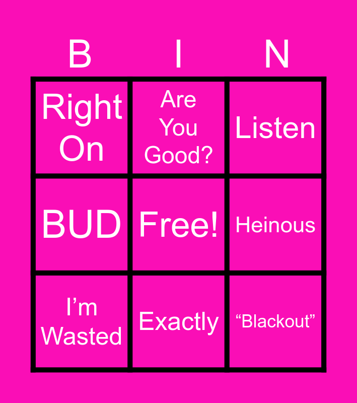 This bingo card has a free space and 8 words: Heinous, Listen, Are You Good?, I’m Wasted, Right On, “Blackout”, BUD and Exactly.