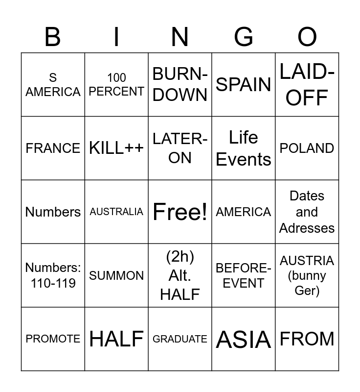 This bingo card has a free space and 94 words: BE-RAISED, GO-UP-YEARS, GRADUATE, FALL-IN-LOVE, CONCEIVE, MOVE-TO, OFFER, PROMOTE, TRANSFER, PRINCIPAL, CAR-ACCIDENT, RETIRED, SETTLE-DOWN, Life Events, DIED, LAID-OFF, BURN-DOWN, DROP-OUT, TAKE-UP TEST, PASS, LICENSE, ESCAPE, MESS-UP, SOLDIER, SUMMON, KILL++, WAR, Nationality Signs, GENERATION, FULL, HALF, (2h) Alt. HALF, CONFLICT, STRONG, 100 PERCENT, COUNTRY, Time Signs, UP-TILL-NOW, LATER-ON, BEFORE-EVENT, Numbers, Numbers: 110-119, Dates and Adresses, Other, FROM, ITSELF, HAPPEN, WRONG, THEREABOUTS, LIE++, FICTIONAL, ASIA, JAPAN, CHINA, TAIWAN, PHILIPPINES, KOREA, INDIA, VIETNAM, HONG KONG, AUSTRALIA, EUROPE, FINLAND (chin), NORWAY (wiggle N), SWEDEN (pear hand), DENMARK (wiggle 3), RUSSIA, HOLLAND (5 hats), FRANCE, ENGLAND, IRELAND, SCOTLAND (plaid), GERMANY, SWITZERLAND (+), SPAIN, ITALY, GREECE, POLAND, AUSTRIA (bunny Ger), MIDDLE EAST, ISRAEL/JEWISH, IRAN, NORTH AND SOUTH AMERICA, AMERICA, S AMERICA, CANADA, MEXICO, INDIGENOUS, FS-CUBA/CUBA, PR, Dominican Republic, AFRICA, EGYPT and SOUTH AFRICA.