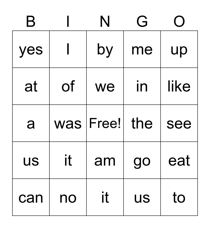 This bingo card has a free space and 24 words: it, no, we, can, up, yes, at, I, the, am, in, a, go, eat, of, us, see, by, like, was, to, us, me and it.