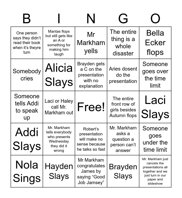 This bingo card has a free space and 25 words: Mr. Markham tells everybody who presents Wednesday they did it wrong, Mr Markham congratulates James by saying “Good Job Jamsey”, Brayden gets a C on the presentation with no explanation, Nola Sings, Bella Ecker flops, One person says they didn’t read their book when it’s theyre turn, Somebody cries, Mantas flops but still gets like an A or something for making him laugh, The entire front row of girls besides Autumn flops, Robert’s presentation will make no sense because he talks so fast, Aries dosent do the presentation, Someone tells Addi to speak up, Mr. Markham asks a question a person can’t answer, Someone goes under the time limit, Alicia Slays, Mr Markham stops a presentation half way through, Laci Slays, Mr Markham yells, Someone goes over the time limit, Laci or Haley call Mr. Markham out, Mr. Markham just cancels the presentations all together and we just turn in our paper and slideshow, Hayden Slays, Addi Slays, The entire thing is a whole disaster and Brayden Slays.