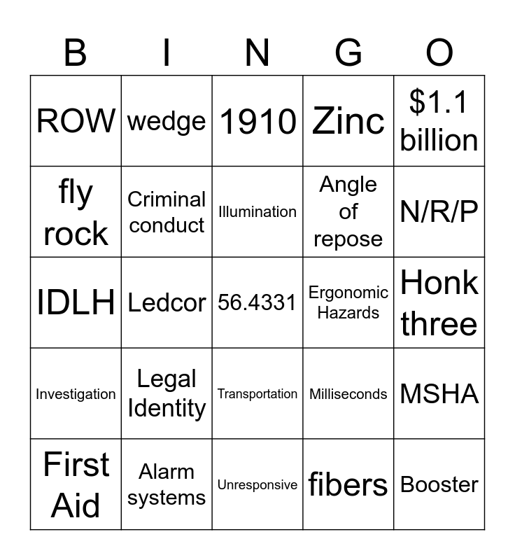 This bingo card has a free space and 24 words: Legal Identity, Alarm systems, Illumination, First Aid, $1.1 billion, ROW, fly rock, wedge, Ergonomic Hazards, Transportation, Angle of repose, IDLH, Milliseconds, MSHA, Criminal conduct, fibers, Honk three, 1910, N/R/P, Ledcor, Booster, Investigation, Zinc and Unresponsive.