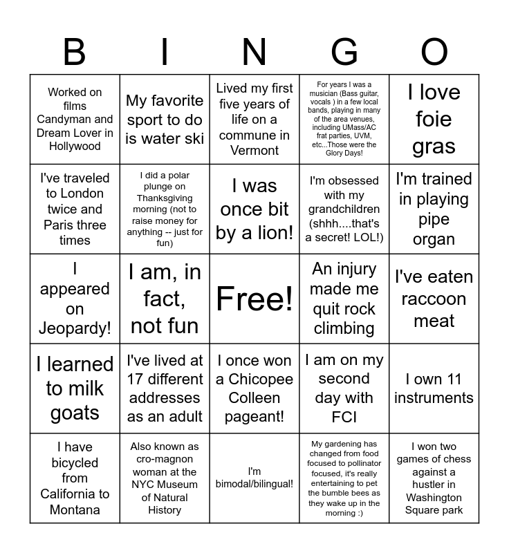 This bingo card has a free space and 27 words: I am on my second day with FCI, I learned to play the didgeridoo when I was on a study abroad semester in Australia, I'm obsessed with my grandchildren (shhh....that's a secret! LOL!), I'm bimodal/bilingual!, I've traveled to London twice and Paris three times, Lived my first five years of life on a commune in Vermont, My favorite sport to do is water ski, I learned to milk goats, An injury made me quit rock climbing, I own 11 instruments, I appeared on Jeopardy!, For years I was a musician (Bass guitar, vocals ) in a few local bands, playing in many of the area venues, including UMass/AC frat parties, UVM, etc...Those were the Glory Days!, I have bicycled from California to Montana, Also known as cro-magnon woman at the NYC Museum of Natural History, I'm trained in playing pipe organ, My commute to work is not as long as you might think, and it's great!, I did a polar plunge on Thanksgiving morning (not to raise money for anything -- just for fun), I was once bit by a lion!, I've lived at 17 different addresses as an adult, Worked on films Candyman and Dream Lover in Hollywood, I've eaten raccoon meat, My gardening has changed from food focused to pollinator focused, it's really entertaining to pet the bumble bees as they wake up in the morning :), I am, in fact, not fun, I won two games of chess against a hustler in Washington Square park, I once won a Chicopee Colleen pageant!, I love foie gras and I started an improv troupe in college.