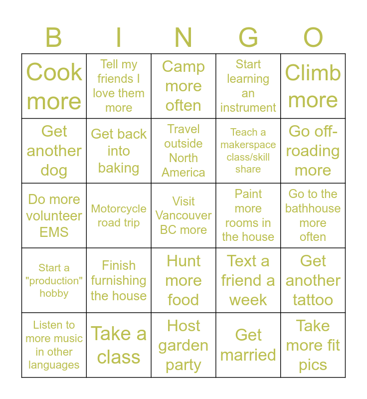 This bingo card has 25 words: Finish furnishing the house, Host garden party, Travel outside North America, Listen to more music in other languages, Climb more, Cook more, Get another dog, Tell my friends I love them more, Paint more rooms in the house, Hunt more food, Teach a makerspace class/skill share, Do more volunteer EMS, Text a friend a week, Get another tattoo, Get back into baking, Take more fit pics, Go to the bathhouse more often, Camp more often, Go off-roading more, Motorcycle road trip, Visit Vancouver BC more, Take a class, Start a "production" hobby, Start learning an instrument and Get married.