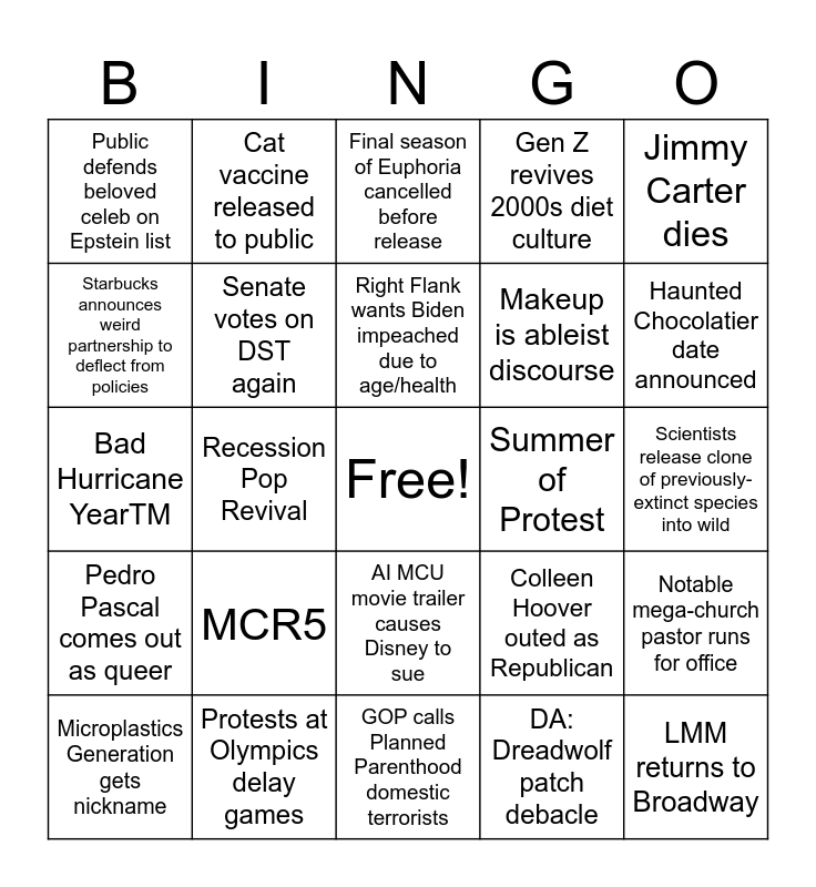This bingo card has a free space and 24 words: MCR5, Protests at Olympics delay games, Right Flank wants Biden impeached due to age/health, Microplastics Generation gets nickname, Jimmy Carter dies, Public defends beloved celeb on Epstein list, Starbucks announces weird partnership to deflect from policies, Cat vaccine released to public, Summer of Protest, AI MCU movie trailer causes Disney to sue, Makeup is ableist discourse, Bad Hurricane YearTM, Colleen Hoover outed as Republican, Notable mega-church pastor runs for office, Senate votes on DST again, DA: Dreadwolf patch debacle, Scientists release clone of previously-extinct species into wild, Final season of Euphoria cancelled before release, Haunted Chocolatier date announced, Recession Pop Revival, LMM returns to Broadway, Pedro Pascal comes out as queer, Gen Z revives 2000s diet culture and GOP calls Planned Parenthood domestic terrorists.