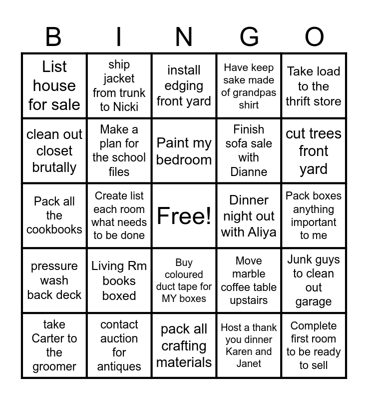 This bingo card has a free space and 24 words: Living Rm books boxed, contact auction for antiques, Paint my bedroom, take Carter to the groomer, Take load to the thrift store, List house for sale, clean out closet brutally, ship jacket from trunk to Nicki, Dinner night out with Aliya, Buy coloured duct tape for MY boxes, Finish sofa sale with Dianne, Pack all the cookbooks, Move marble coffee table upstairs, Junk guys to clean out garage, Make a plan for the school files, Host a thank you dinner Karen and Janet, Pack boxes anything important to me, install edging front yard, cut trees front yard, Create list each room what needs to be done, Complete first room to be ready to sell, pressure wash back deck, Have keep sake made of grandpas shirt and pack all crafting materials.