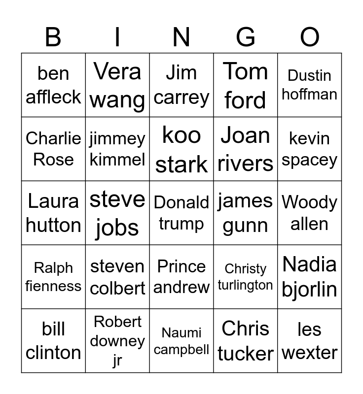 This bingo card has a free space and 29 words: bill clinton, Obama, steve jobs, Bill gates, ben affleck, Jim carrey, jimmey kimmel, steven colbert, james gunn, Robert downey jr, Woody allen, les wexter, Naumi campbell, Chris tucker, kevin spacey, Alan Deshawitz, Prince andrew, Ralph fienness, Dustin hoffman, Laura hutton, Christy turlington, henry kissinger, Joan rivers, Charlie Rose, Tom ford, Vera wang, Nadia bjorlin, koo stark and seth green.