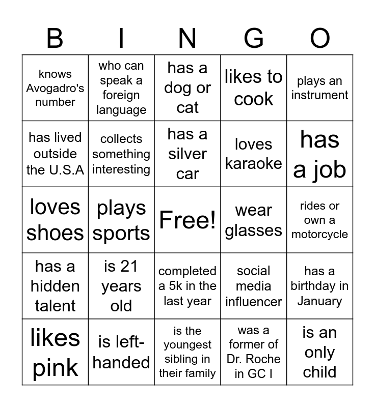 This bingo card has a free space and 24 words: likes pink, is 21 years old, has a silver car, was a former of Dr. Roche in GC I, plays an instrument, knows Avogadro's number, who can speak a foreign language, has a dog or cat, wear glasses, rides or own a motorcycle, loves shoes, collects something interesting, social media influencer, has a birthday in January, has lived outside the U.S.A, is left-handed, is the youngest sibling in their family, likes to cook, has a job, has a hidden talent, plays sports, completed a 5k in the last year, loves karaoke and is an only child.