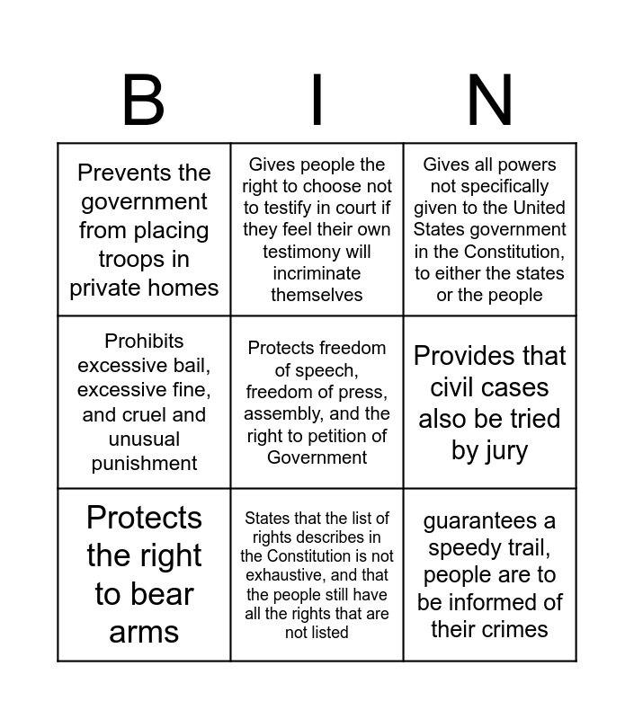 This bingo card has a free space and 9 words: Protects the right to bear arms, Gives all powers not specifically given to the United States government in the Constitution, to either the states or the people, Gives people the right to choose not to testify in court if they feel their own testimony will incriminate themselves, Prohibits excessive bail, excessive fine, and cruel and unusual punishment, Prevents the government from placing troops in private homes, Provides that civil cases also be tried by jury, guarantees a speedy trail, people are to be informed of their crimes, protects from unreasonable search and seizure of property of US citizens and States that the list of rights describes in the Constitution is not exhaustive, and that the people still have all the rights that are not listed.