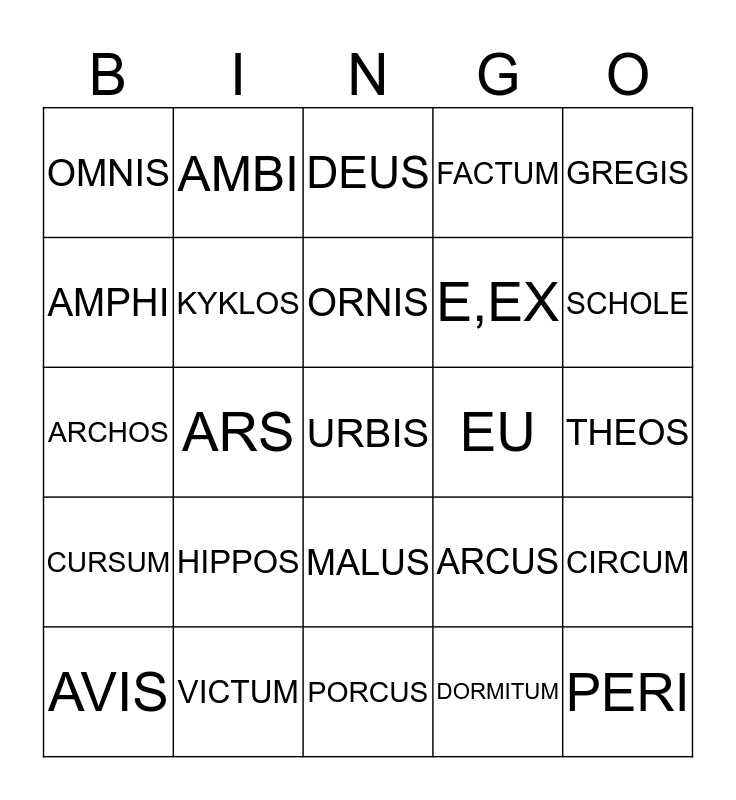 This bingo card has 25 words: HIPPOS, PORCUS, ORNIS, AVIS, GREGIS, OMNIS, AMPHI, AMBI, EU, MALUS, E,EX, ARCHOS, ARCUS, CIRCUM, KYKLOS, PERI, THEOS, DEUS, SCHOLE, ARS, URBIS, VICTUM, CURSUM, FACTUM and DORMITUM.