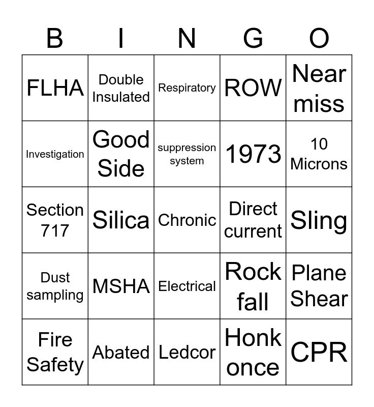 This bingo card has 25 words: MSHA, Ledcor, suppression system, Fire Safety, Near miss, FLHA, Investigation, Double Insulated, Direct current, Electrical, 1973, Section 717, Rock fall, Plane Shear, Good Side, CPR, Sling, Respiratory, 10 Microns, Silica, Chronic, Abated, Dust sampling, ROW and Honk once.