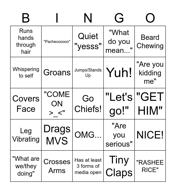 This bingo card has a free space and 24 words: Drags MVS, Crosses Arms, Jumps/Stands Up, "What are we/they doing", Beard Chewing, Runs hands through hair, Whispering to self, "Pachecooooo", "Let's go!", OMG..., Yuh!, Covers Face, "Are you serious", NICE!, Groans, Tiny Claps, "GET HIM", Quiet "yesss", "Are you kidding me", "COME ON >_<", "RASHEE RICE", Leg Vibrating, "What do you mean..." and Has at least 3 forms of media open.
