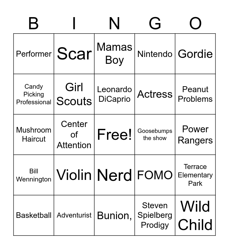This bingo card has a free space and 50 words: Tomboy, Wild Child, 2% milk, Bunion,, Violin, Choir, Scar, Pink, Candy Picking Professional, Bharatanatyam, Girl Scouts, Nintendo, Terrace Elementary Park, FOMO, Florida, Deck of Cards, Leonardo DiCaprio, Goosebumps the show, Thadi Vava, Gordie, Center of Attention, Steven Spielberg Prodigy, Performer, Actress, Puppy Fever, Kichidi, Peanut Problems, Chocolate Milk, Mamas Boy, Nerd, Book Worm, Dragon Ball Z, Green, Lone Wolf, Adventurist, Little Mermaid, Tweety Bird, Butcher Shop, Tree Climber, Power Rangers, Bank Robber, Lawyer, Bill Clinton, Nomad, Basketball, Mushroom Haircut, Sleepy Head, Megan, Bill Wennington and National Restaurant Association.