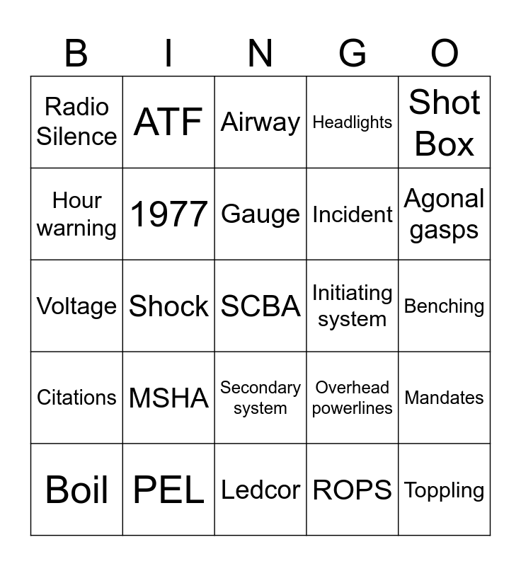 This bingo card has 25 words: MSHA, Ledcor, Gauge, Boil, Shot Box, Radio Silence, Hour warning, ATF, Initiating system, Secondary system, Incident, Voltage, Overhead powerlines, Mandates, 1977, Toppling, Benching, Airway, Agonal gasps, Shock, SCBA, PEL, Citations, Headlights and ROPS.
