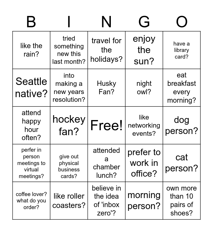 This bingo card has a free space and 24 words: give out physical business cards?, like roller coasters?, Husky Fan?, coffee lover? what do you order?, have a library card?, like the rain?, Seattle native?, tried something new this last month?, like networking events?, attended a chamber lunch?, night owl?, attend happy hour often?, prefer to work in office?, cat person?, into making a new years resolution?, morning person?, dog person?, travel for the holidays?, eat breakfast every morning?, hockey fan?, own more than 10 pairs of shoes?, perfer in person meetings to virtual meetings?, enjoy the sun? and believe in the idea of 'inbox zero'?.