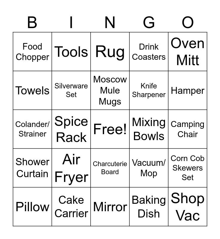 This bingo card has a free space and 35 words: Crock Pot/ Slow Cooker, Blanket/ Afghan, Blender, Silverware Set, Charcuterie Board, Drink Coasters, Towels, Sheet Set, Moscow Mule Mugs, Glassware Set, Colander/ Strainer, Oven Mitt, Measuring Spoons/ Cups, Cutting Board, Food Chopper, Mixing Bowls, Baking Dish, Spice Rack, Shower Curtain, Shop Vac, Vacuum/ Mop, Pillow, Corn Cob Skewers Set, Cake Carrier, Rug, Hamper, Picture Frame, Trash Can, Knife Sharpener, Camping Chair, Cooler, Mirror, Air Fryer, Tools and Grilling Item.