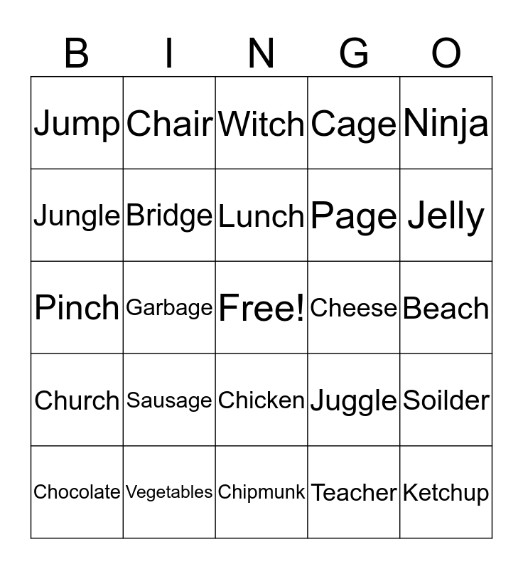 This bingo card has a free space and 24 words: Sausage, Vegetables, Lunch, Chocolate, Ninja, Jump, Jungle, Chair, Cheese, Chicken, Page, Pinch, Juggle, Soilder, Bridge, Teacher, Beach, Witch, Jelly, Garbage, Ketchup, Church, Cage and Chipmunk.