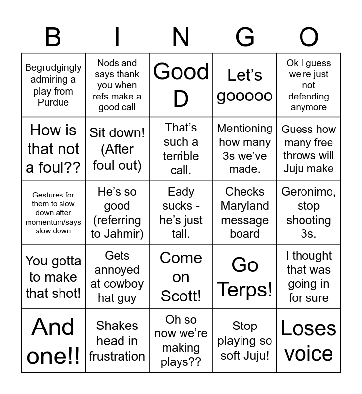This bingo card has 25 words: Gets annoyed at cowboy hat guy, Oh so now we’re making plays??, That’s such a terrible call., And one!!, Ok I guess we’re just not defending anymore, Begrudgingly admiring a play from Purdue, How is that not a foul??, Nods and says thank you when refs make a good call, Checks Maryland message board, Come on Scott!, Mentioning how many 3s we’ve made., Gestures for them to slow down after momentum/says slow down, Go Terps!, I thought that was going in for sure, Sit down! (After foul out), Loses voice, Geronimo, stop shooting 3s., Good D, Guess how many free throws will Juju make, He’s so good (referring to Jahmir), Eady sucks - he’s just tall., Shakes head in frustration, You gotta to make that shot!, Let’s gooooo and Stop playing so soft Juju!.