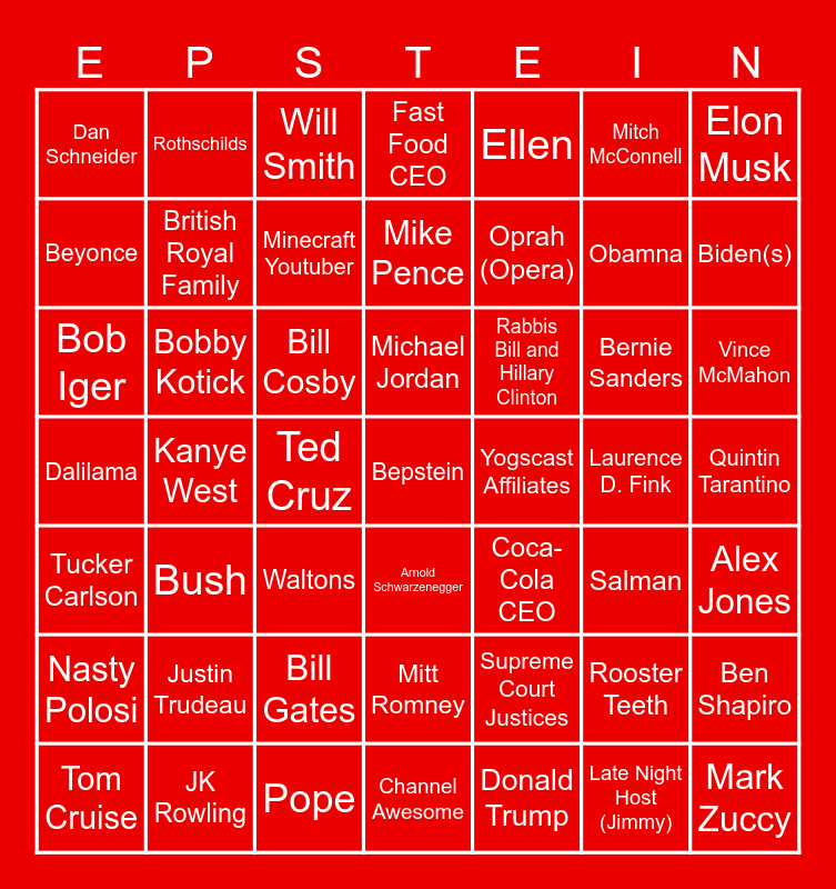 This bingo card has a free space and 55 words: Donald Trump, Vince McMahon, Erik Prince, Dan Schneider, Kanye West, Justin Trudeau, Elon Musk, Jeffery Bezos, British Royal Family, Bill Gates, Fast Food CEO, Alex Jones, Quintin Tarantino, Laurence D. Fink, Tom Cruise, Tucker Carlson, Ellen, Oprah (Opera), Late Night Host (Jimmy), Obamna, Biden(s), Bush, Rabbis Bill and Hillary Clinton, Will Smith, Algore, Beyonce, Ted Cruz, Tim Allen, Bob Iger, Bernie Sanders, Jeb Bush, Salman, Ben Shapiro, JK Rowling, Mitch McConnell, Mike Pence, Nasty Polosi, Bobby Kotick, Mark Zuccy, Waltons, Rothschilds, Mitt Romney, Supreme Court Justices, Kamala Harris, Bill Cosby, Dalilama, Pope, Coca-Cola CEO, Yogscast Affiliates, Minecraft Youtuber, Arnold Schwarzenegger, Rooster Teeth, Channel Awesome, Michael Jordan and Souljaboy.