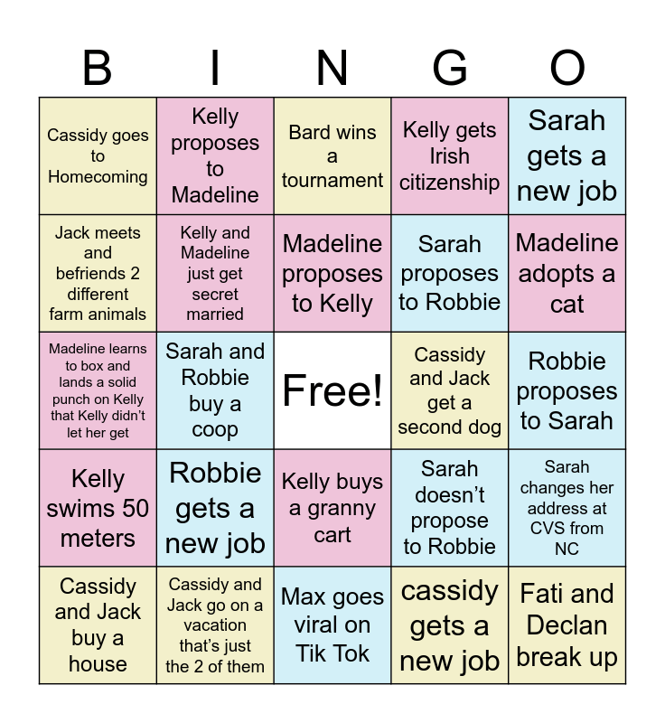 This bingo card has a free space and 24 words: Robbie gets a new job, Cassidy and Jack go on a vacation that’s just the 2 of them, Madeline proposes to Kelly, Cassidy and Jack buy a house, Sarah gets a new job, Cassidy goes to Homecoming, Jack meets and befriends 2 different farm animals, Kelly proposes to Madeline, Cassidy and Jack get a second dog, Kelly buys a granny cart, Sarah proposes to Robbie, Madeline learns to box and lands a solid punch on Kelly that Kelly didn’t let her get, Sarah doesn’t propose to Robbie, Sarah changes her address at CVS from NC, Kelly and Madeline just get secret married, cassidy gets a new job, Robbie proposes to Sarah, Bard wins a tournament, Madeline adopts a cat, Sarah and Robbie buy a coop, Fati and Declan break up, Kelly swims 50 meters, Kelly gets Irish citizenship and Max goes viral on Tik Tok.