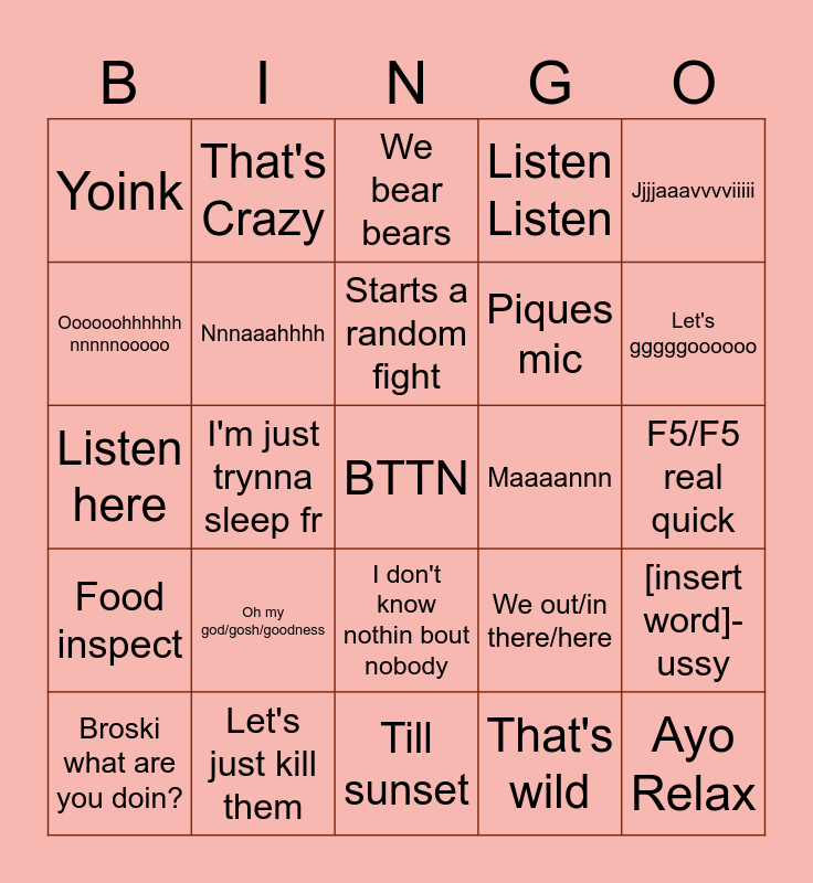 This bingo card has a free space and 24 words: Oh my god/gosh/goodness, Let's just kill them, Starts a random fight, Broski what are you doin?, Jjjjaaavvvviiiii, Yoink, Oooooohhhhhh nnnnnooooo, That's Crazy, Maaaannn, I don't know nothin bout nobody, Piques mic, Listen here, We out/in there/here, [insert word]-ussy, Nnnaaahhhh, That's wild, F5/F5 real quick, We bear bears, Let's gggggoooooo, I'm just trynna sleep fr, Ayo Relax, Food inspect, Listen Listen and Till sunset.