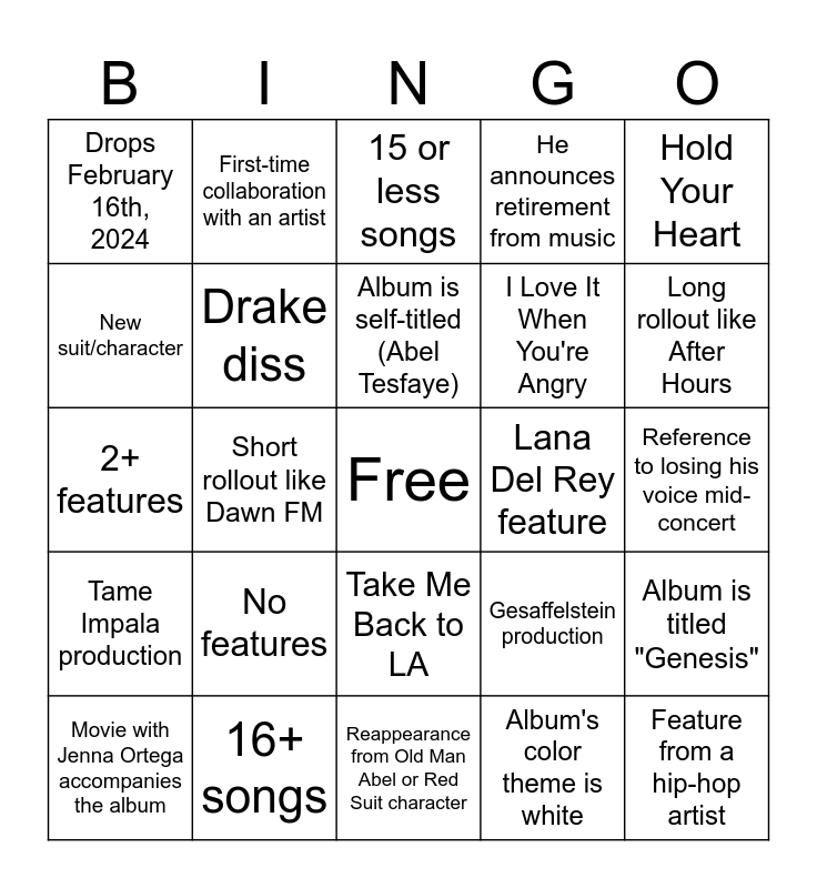This bingo card has a free space and 24 words: No features, 16+ songs, Album is self-titled (Abel Tesfaye), Movie with Jenna Ortega accompanies the album, Hold Your Heart, Drops February 16th, 2024, New suit/character, First-time collaboration with an artist, Lana Del Rey feature, Take Me Back to LA, I Love It When You're Angry, 2+ features, Gesaffelstein production, Album is titled "Genesis", Drake diss, Album's color theme is white, Reference to losing his voice mid-concert, 15 or less songs, Long rollout like After Hours, Short rollout like Dawn FM, Feature from a hip-hop artist, Tame Impala production, He announces retirement from music and Reappearance from Old Man Abel or Red Suit character.