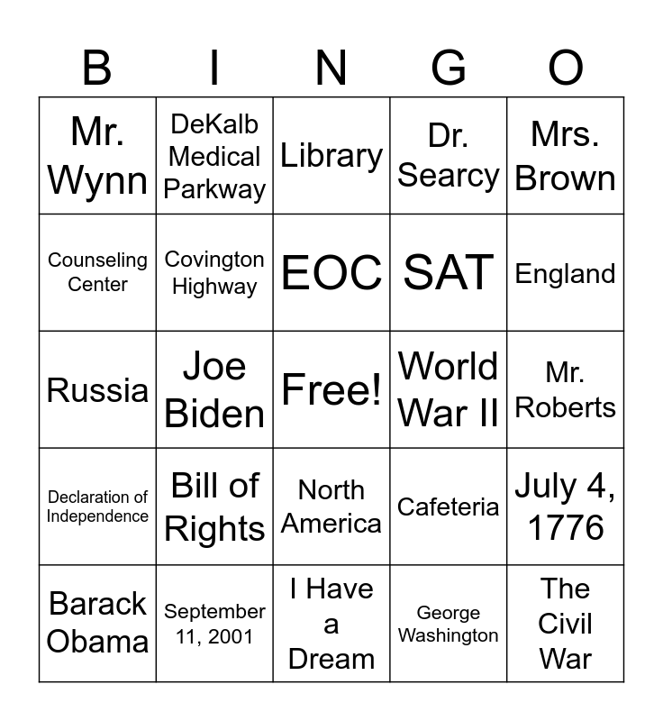This bingo card has a free space and 24 words: Bill of Rights, September 11, 2001, EOC, Barack Obama, Mrs. Brown, Mr. Wynn, Counseling Center, DeKalb Medical Parkway, World War II, North America, SAT, Russia, Cafeteria, July 4, 1776, Covington Highway, George Washington, Mr. Roberts, Library, England, Joe Biden, The Civil War, Declaration of Independence, Dr. Searcy and I Have a Dream.