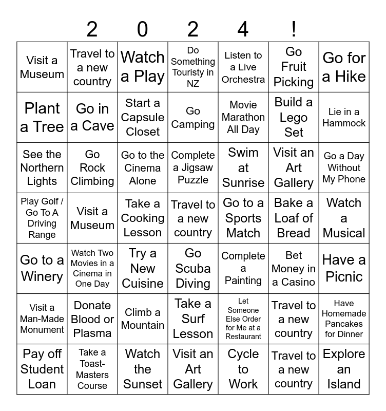This bingo card has 49 words: Travel to a new country, Build a Lego Set, Cycle to Work, Visit a Museum, Go to the Cinema Alone, Watch a Musical, Travel to a new country, Watch the Sunset, Go Fruit Picking, Go Scuba Diving, Go for a Hike, Do Something Touristy in NZ, Visit an Art Gallery, Swim at Sunrise, Donate Blood or Plasma, Bake a Loaf of Bread, Plant a Tree, Lie in a Hammock, Have Homemade Pancakes for Dinner, Listen to a Live Orchestra, Movie Marathon All Day, Take a Cooking Lesson, Visit a Museum, Go in a Cave, Pay off Student Loan, Start a Capsule Closet, Go a Day Without My Phone, Take a Toast-Masters Course, Complete a Jigsaw Puzzle, Go Rock Climbing, Explore an Island, Go to a Sports Match, Visit a Man-Made Monument, Climb a Mountain, Play Golf / Go To A Driving Range, Complete a Painting, Bet Money in a Casino, Have a Picnic, See the Northern Lights, Try a New Cuisine, Take a Surf Lesson, Go to a Winery, Travel to a new country, Visit an Art Gallery, Go Camping, Watch a Play, Let Someone Else Order for Me at a Restaurant, Watch Two Movies in a Cinema in One Day and Travel to a new country.