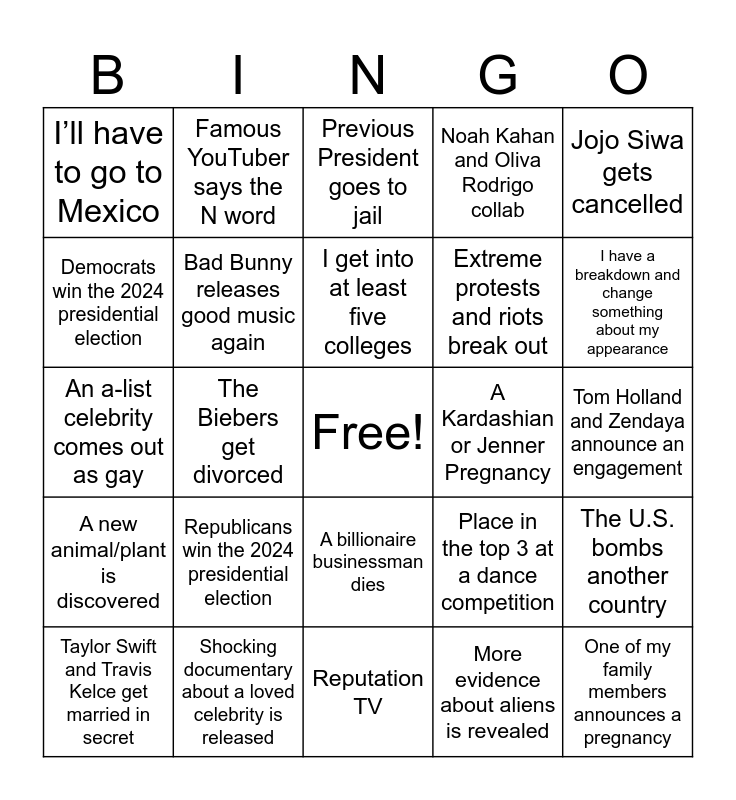 This bingo card has a free space and 24 words: Republicans win the 2024 presidential election, Shocking documentary about a loved celebrity is released, I get into at least five colleges, Taylor Swift and Travis Kelce get married in secret, Jojo Siwa gets cancelled, I’ll have to go to Mexico, Democrats win the 2024 presidential election, Famous YouTuber says the N word, A Kardashian or Jenner Pregnancy, A billionaire businessman dies, Extreme protests and riots break out, An a-list celebrity comes out as gay, Place in the top 3 at a dance competition, The U.S. bombs another country, Bad Bunny releases good music again, More evidence about aliens is revealed, Tom Holland and Zendaya announce an engagement, Previous President goes to jail, I have a breakdown and change something about my appearance, The Biebers get divorced, One of my family members announces a pregnancy, A new animal/plant is discovered, Noah Kahan and Oliva Rodrigo collab and Reputation TV.