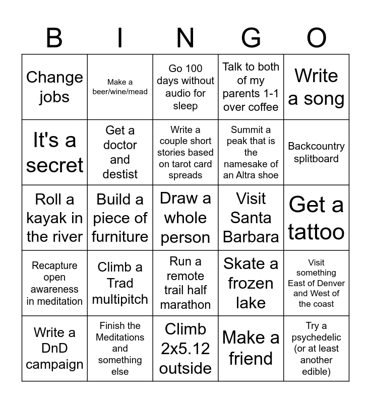 This bingo card has 25 words: Climb a Trad multipitch, Climb 2x5.12 outside, Write a couple short stories based on tarot card spreads, Write a DnD campaign, Write a song, Change jobs, It's a secret, Make a beer/wine/mead, Visit Santa Barbara, Run a remote trail half marathon, Summit a peak that is the namesake of an Altra shoe, Roll a kayak in the river, Skate a frozen lake, Visit something East of Denver and West of the coast, Get a doctor and destist, Try a psychedelic (or at least another edible), Get a tattoo, Go 100 days without audio for sleep, Backcountry splitboard, Build a piece of furniture, Draw a whole person, Finish the Meditations and something else, Recapture open awareness in meditation, Talk to both of my parents 1-1 over coffee and Make a friend.