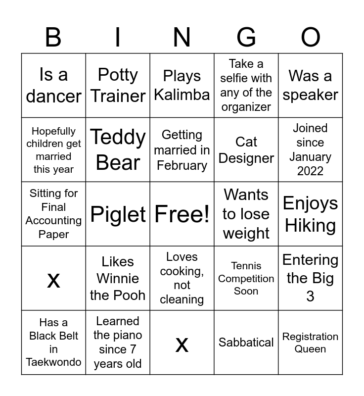 This bingo card has a free space and 24 words: Likes Winnie the Pooh, Learned the piano since 7 years old, Getting married in February, Has a Black Belt in Taekwondo, Was a speaker, Is a dancer, Hopefully children get married this year, Potty Trainer, Wants to lose weight, Loves cooking, not cleaning, Cat Designer, Sitting for Final Accounting Paper, Tennis Competition Soon, Entering the Big 3, Teddy Bear, Sabbatical, Enjoys Hiking, Plays Kalimba, Joined since January 2022, Piglet, Registration Queen, x, Take a selfie with any of the organizer and x.