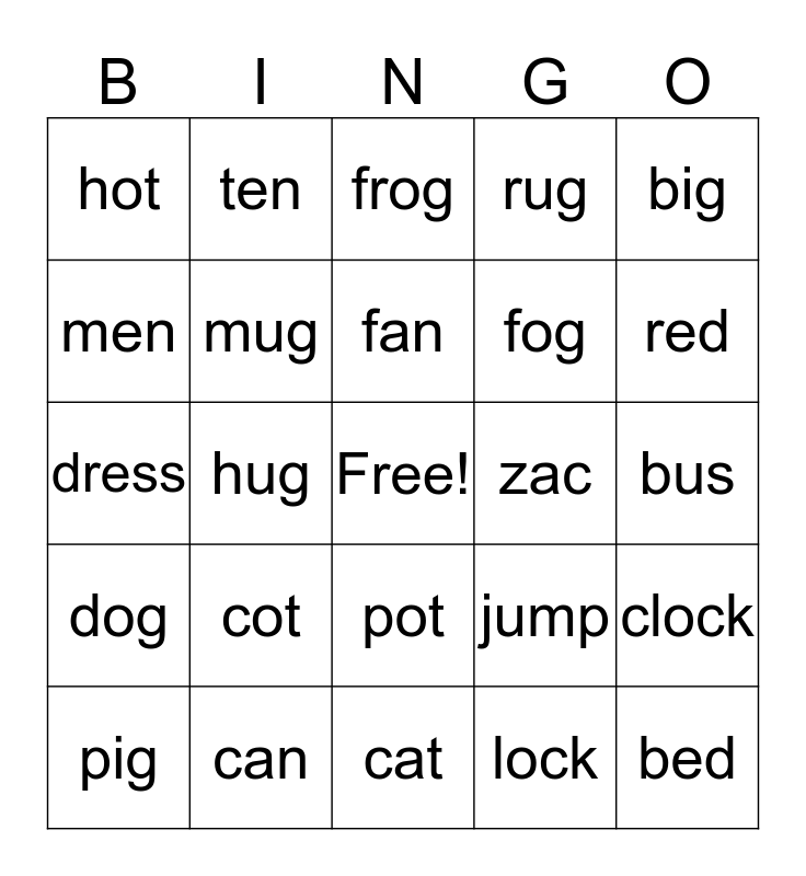This bingo card has a free space and 24 words: cot, can, fan, pig, big, hot, men, ten, zac, pot, fog, dress, jump, clock, mug, lock, bus, frog, red, hug, bed, dog, rug and cat.