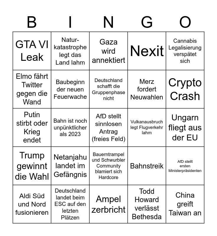 This bingo card has a free space and 24 words: Netanjahu landet im Gefängnis, Deutschland landet beim ESC auf den letzten Plätzen, Deutschland schafft die Gruppenphase nicht, Aldi Süd und Nord fusionieren, Cannabis Legalisierung verspätet sich, GTA VI Leak, Elmo fährt Twitter gegen die Wand, Natur-katastrophe legt das Land lahm, Vulkanausbruch legt Flugverkehr lahm, Bauerntrampel und Schwurbler Community blamiert sich Hardcore, Merz fordert Neuwahlen, Putin stirbt oder Krieg endet, Bahnstreik, AfD stellt ersten Ministerpräsidenten, Baubeginn der neuen Feuerwache, Todd Howard verlässt Bethesda, Ungarn fliegt aus der EU, Gaza wird annektiert, Crypto Crash, Bahn ist noch unpünktlicher als 2023, China greift Taiwan an, Trump gewinnt die Wahl, Nexit and Ampel zerbricht.