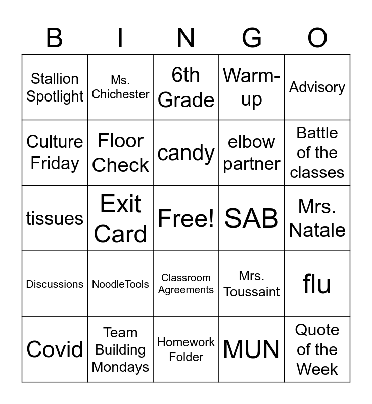 This bingo card has a free space and 26 words: Classroom Agreements, MUN, candy, Team Building Mondays, Advisory, Stallion Spotlight, Culture Friday, Ms. Chichester, Mrs. Natale, Mrs. Toussaint, elbow partner, tissues, flu, Covid, Exit Card, Fishbowl, Warm-up, Discussions, 6th Grade, Quote of the Week, Battle of the classes, Homework Folder, SAB, NoodleTools, Floor Check and Agenda.