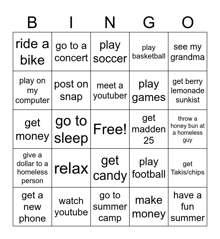 This bingo card has a free space and 24 words: relax, watch youtube, meet a youtuber, get a new phone, see my grandma, ride a bike, play on my computer, go to a concert, get madden 25, get candy, play games, get money, play football, get Takis/chips, post on snap, make money, throw a honey bun at a homeless guy, play soccer, get berry lemonade sunkist, go to sleep, have a fun summer, give a dollar to a homeless person, play basketball and go to summer camp.