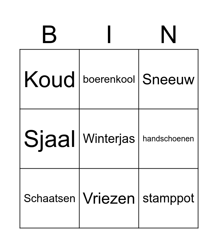This bingo card has a free space and 17 words: Winter, Ijs, Sneeuw, Koud, Wanten, Sjaal, Sneeuwpop, Schaatsen, Vriezen, handschoenen, sneeuwvlokken, skieën, stamppot, boerenkool, kachel, Das and Slee.