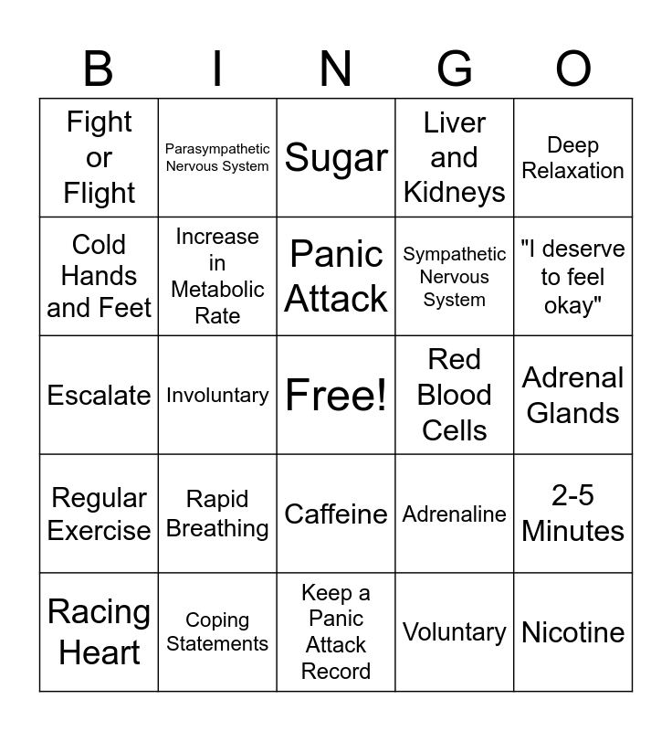 This bingo card has a free space and 25 words: Rapid Breathing, Keep a Panic Attack Record, Panic Attack, Racing Heart, Deep Relaxation, Fight or Flight, Cold Hands and Feet, Parasympathetic Nervous System, Red Blood Cells, Caffeine, Sympathetic Nervous System, Escalate, Adrenaline, 2-5 Minutes, Increase in Metabolic Rate, Breathing Exercises, Adrenal Glands, Sugar, "I deserve to feel okay", Involuntary, Nicotine, Coping Statements, Regular Exercise, Liver and Kidneys and Voluntary.