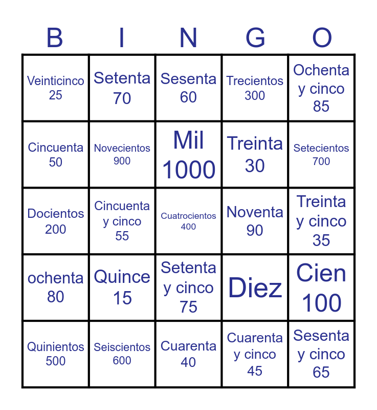 This bingo card has a free space and 27 words: Diez, Veinte 20, Treinta 30, Cuarenta 40, Cincuenta 50, Sesenta 60, Setenta 70, ochenta 80, Noventa 90, Cien 100, Docientos 200, Trecientos 300, Quinientos 500, Seiscientos 600, Setecientos 700, Ochocientos 800, Novecientos 900, Mil 1000, Quince 15, Veinticinco 25, Treinta y cinco 35, Cuarenta y cinco 45, Cincuenta y cinco 55, Sesenta y cinco 65, Setenta y cinco 75, Ochenta y cinco 85 and Noventa y cinco 95.